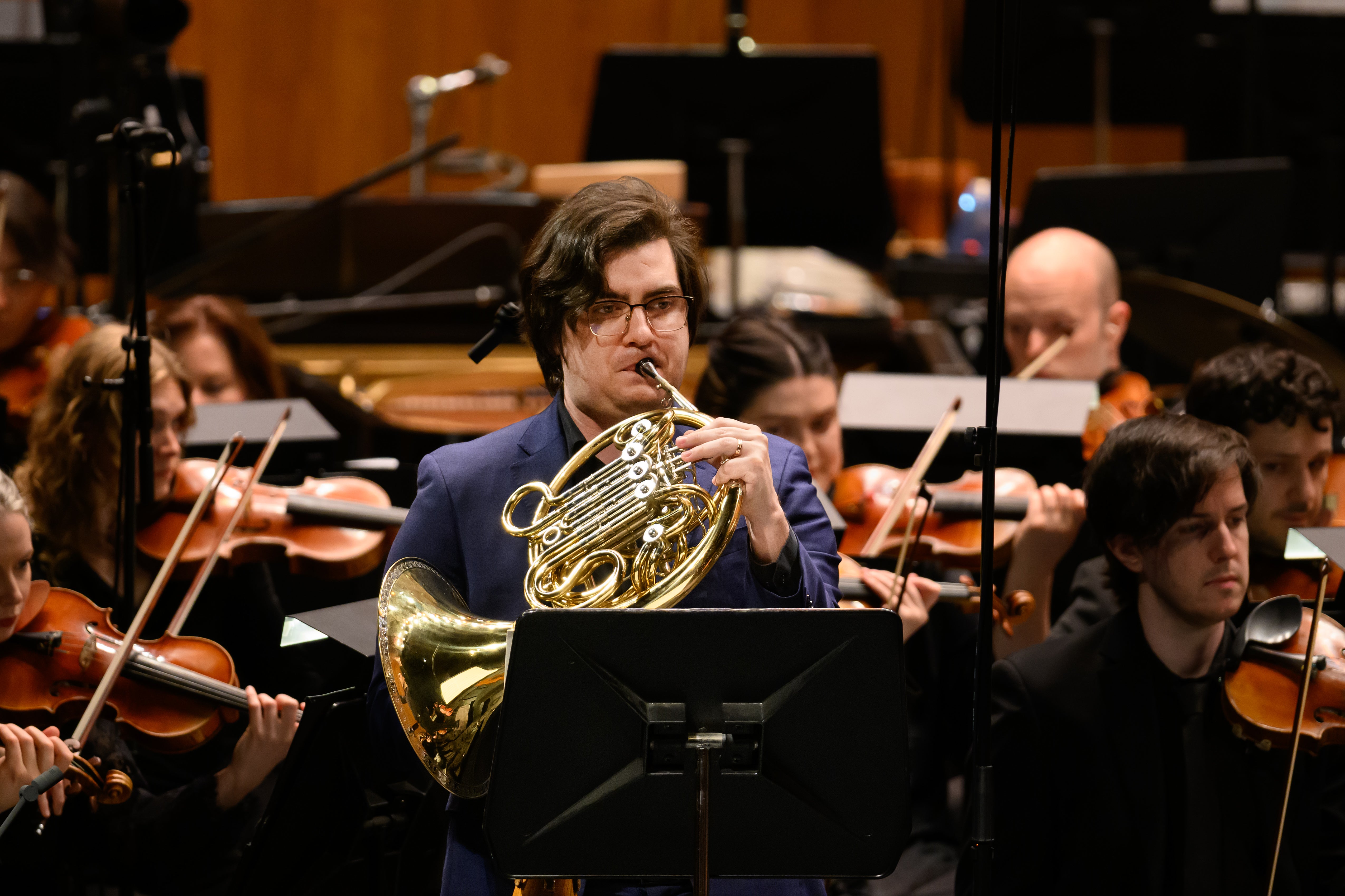 Baldwin's gift of tongues was a concerto written for our Assistant Principal Third Horn, Scott Leger. It featured dazzling virtuosity and unorthodox sounds, as well as brass musicians playing from the balcony. The piece drew inspiration from Chapter 2 of the Acts of the Apostles, and Giang envisioned the horn soloist as the translator and unifier of the orchestra's varied "tongues."