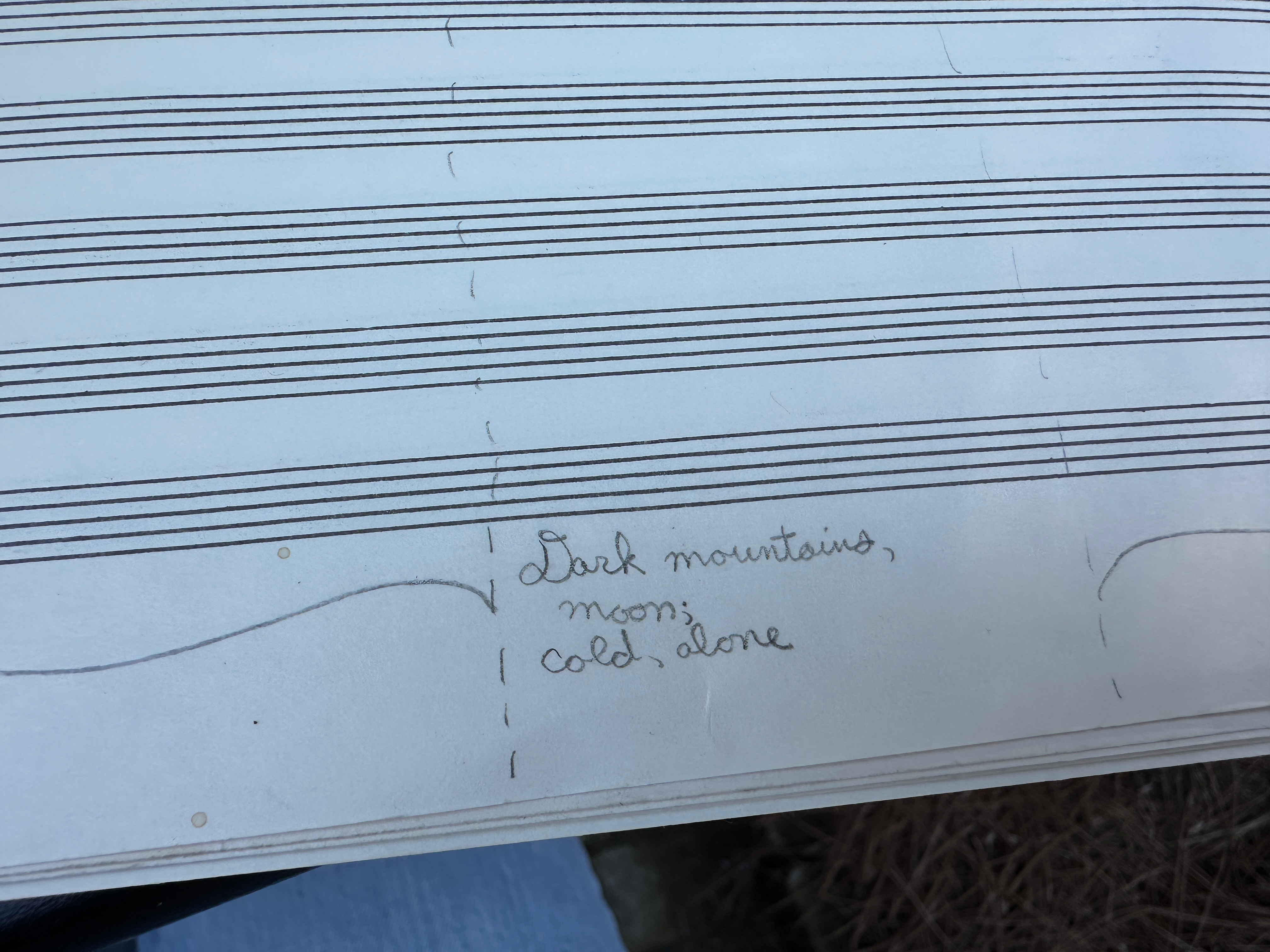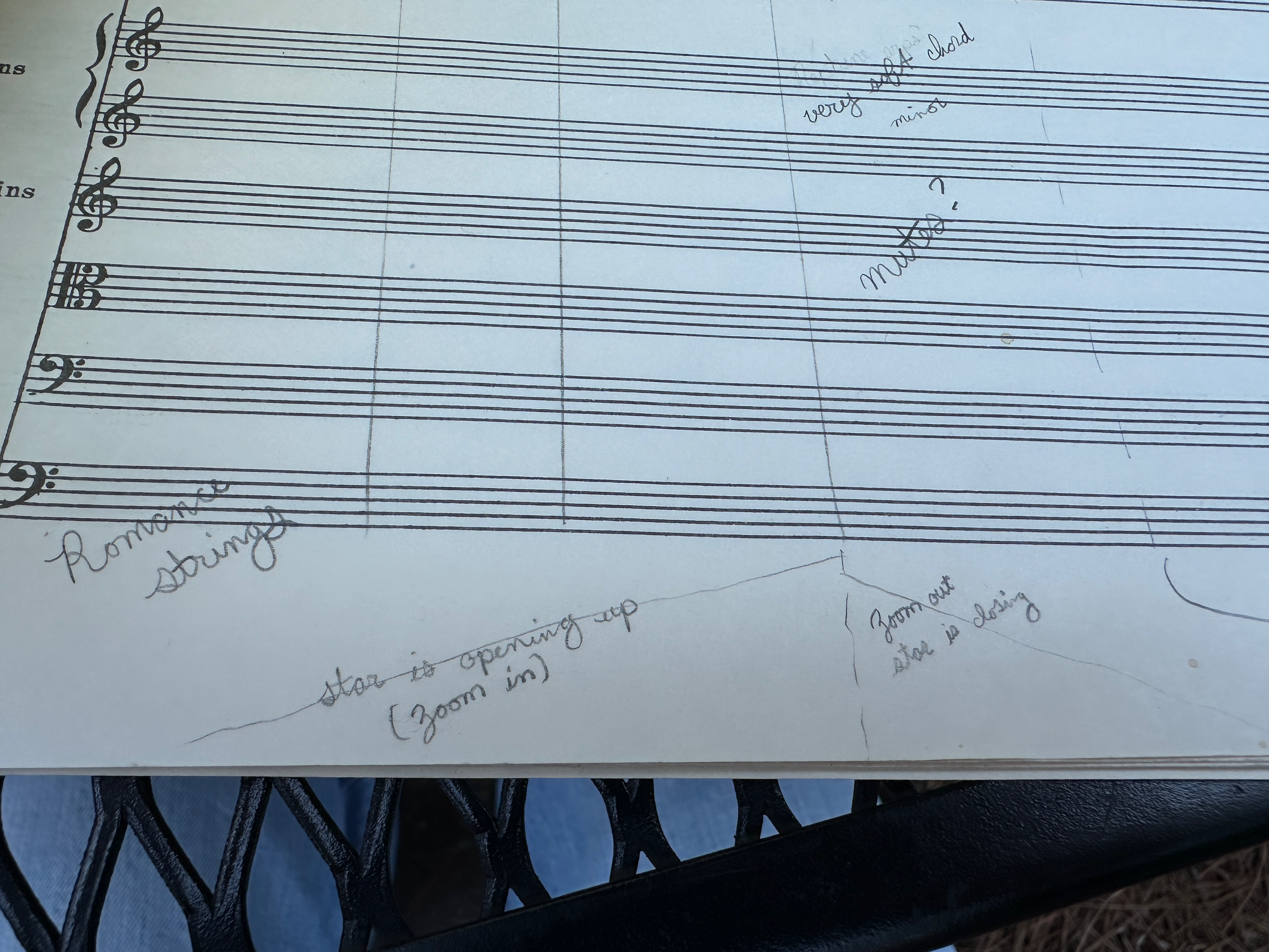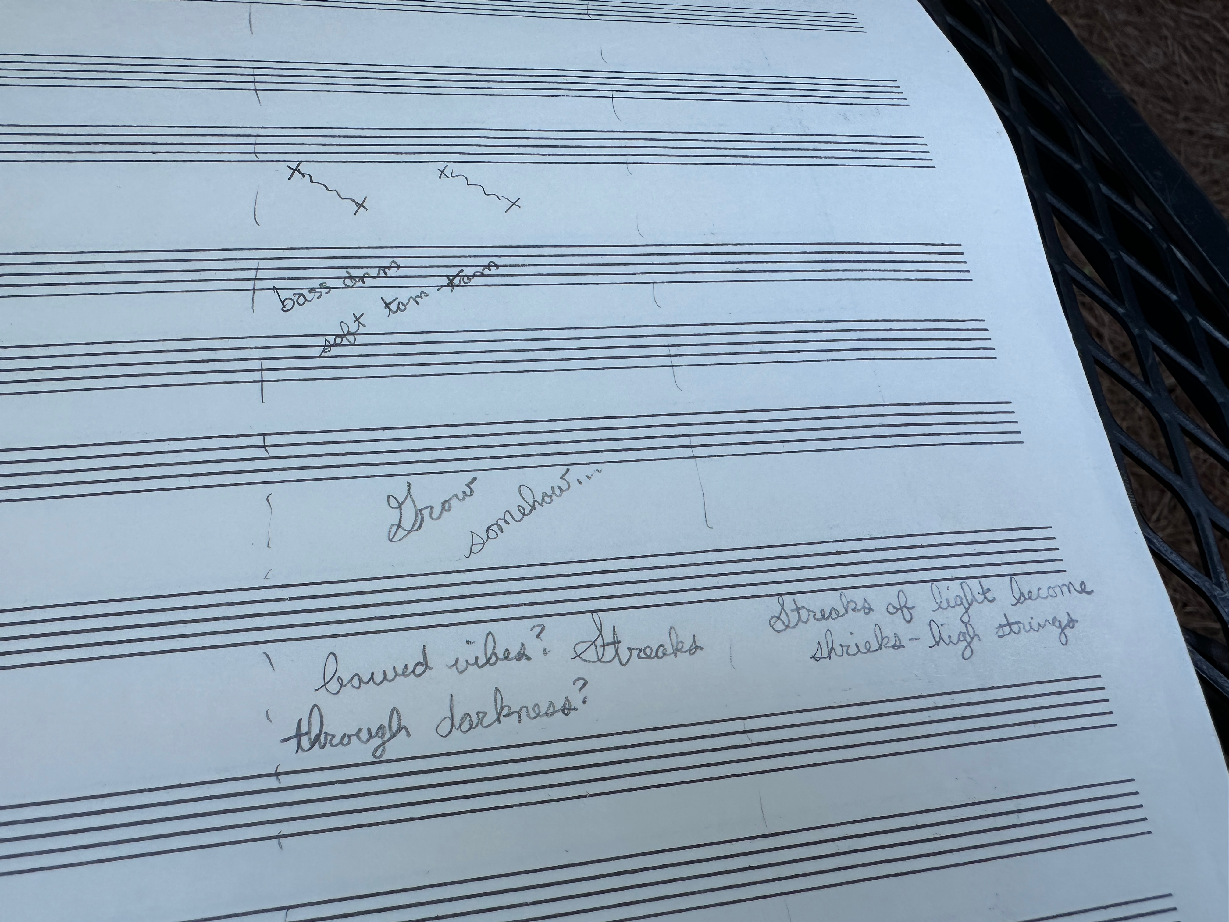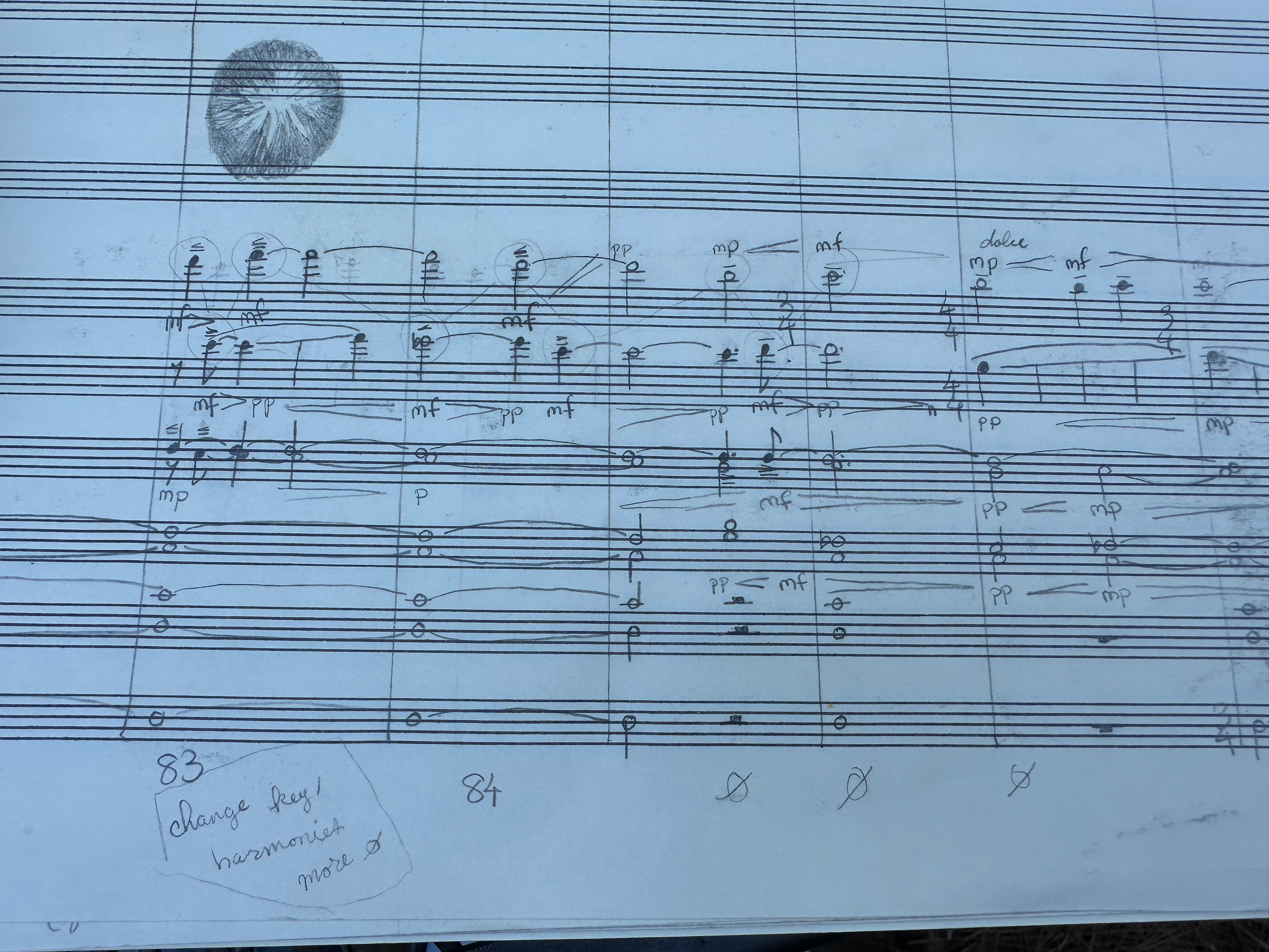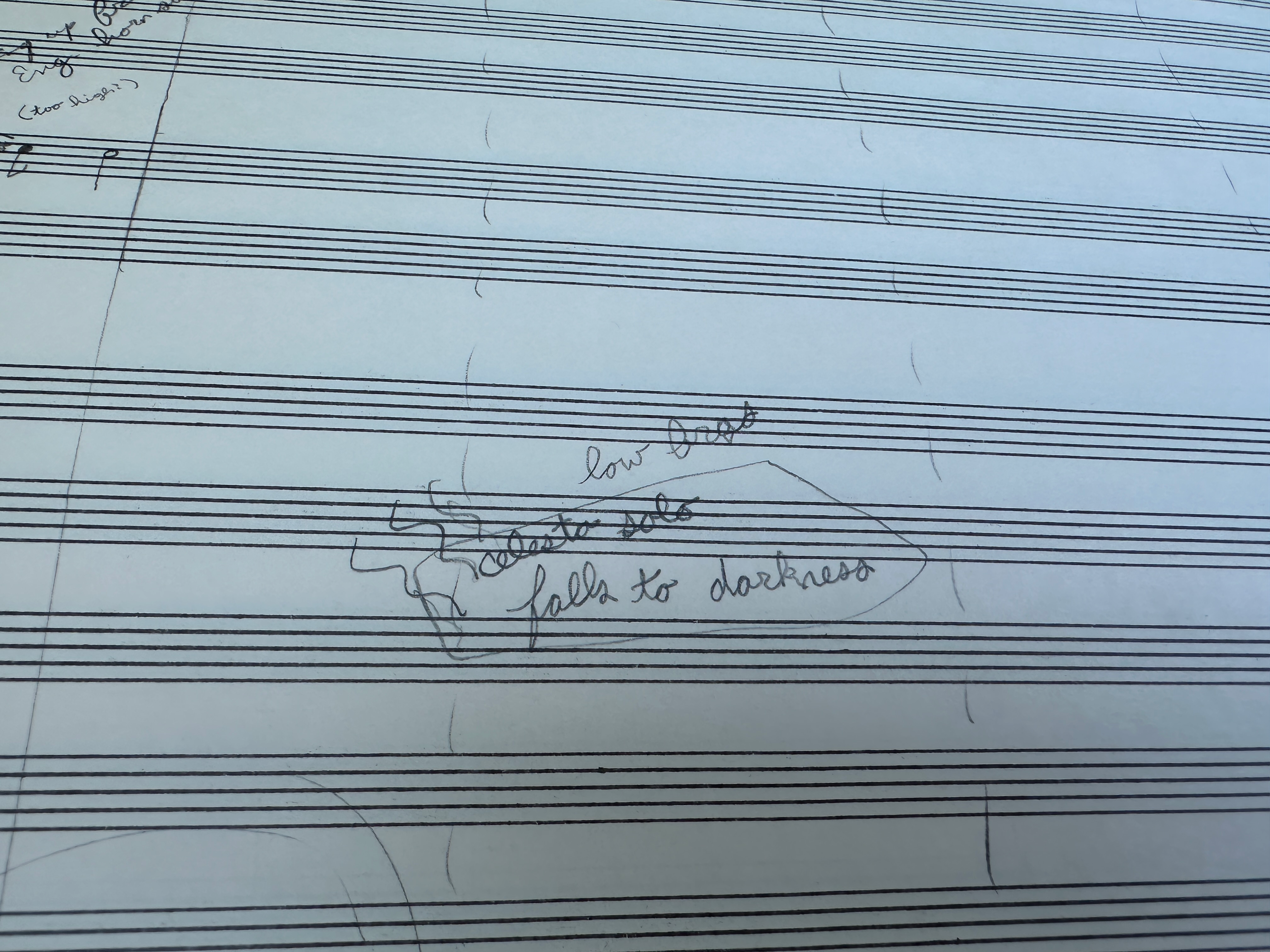 The other sketch, from 2019, was titled Sighing Thaws the Frozen Birch. It came from the idea of a character walking through a frozen landscape, full of painful thoughts—a bit like Debussy’s Des pas sur la neige, which I’m a bit obsessed with. It was all about timbre and texture rather than melody, though it uses an insistent “ti-do-re” motive that seems to beg for resolution, finally collapsing into an angry wall of cadential 6/4 that melts away. I was in a strange headspace then—the score is full of cryptic notes like “low push,” “high push,” and little drawings of lungs, crows, and trees. I think it was meant for Aspen readings that year, but I scrapped it and wrote a new piece instead—A Hidden Sun Rises, which the LO is performing this month. I don’t remember why I abandoned Sighing Thaws, but I’m glad to have both now.